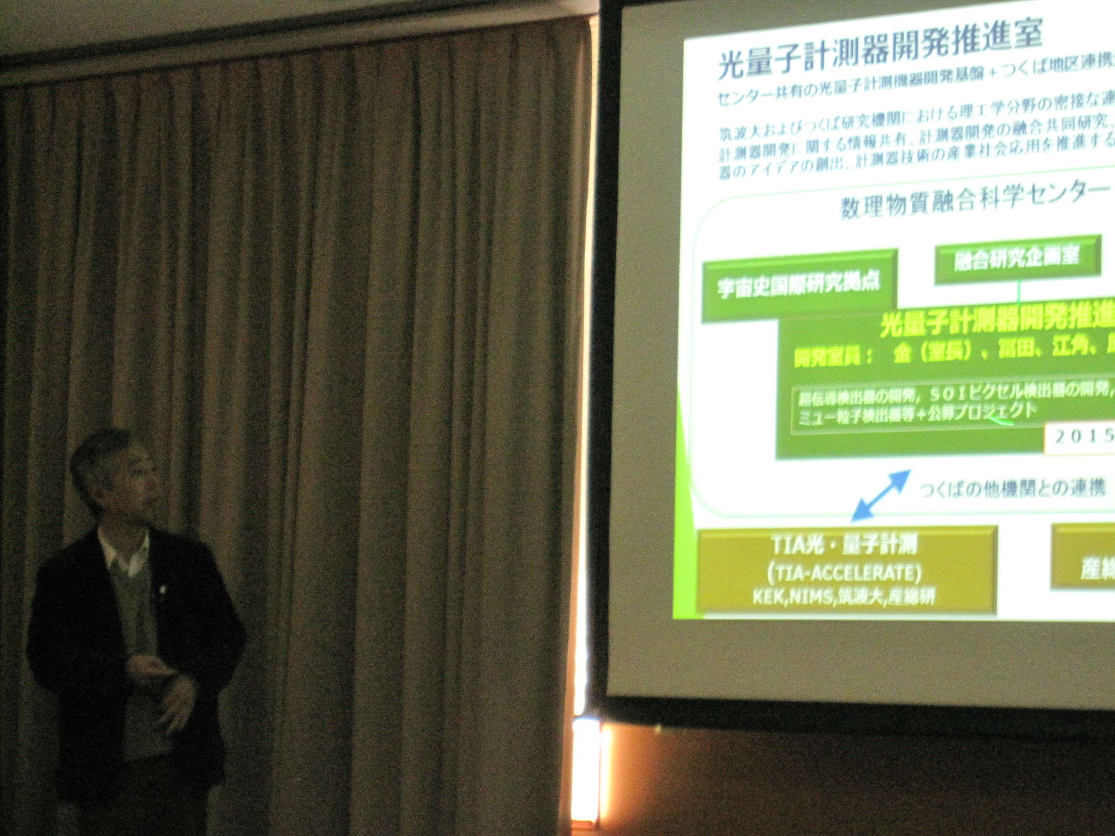 このワークショップは、光量子計測器に関する情報の共有、融合共同研究、新型計測技術の創出、産業・社会への応用を推進するために、理工連携・つくば連携のもとに光量子計測器開発研究の情報交換と議論を行うことを目的として筑波大学数理物質融合科学センター光量子計測器開発推進室が主催してTIA光・量子計測の共催で開催されました。 KEK、産総研、東京大学からの参加者を含めて22名の研究者が参加し、約5時間半にわたって興味深く貴重な研究内容の講演と活発な議論が行われました。特に、医学医療系の講演者2名による講演と議論によって、計測器の医学利用に関する新たな情報が共有できました。光量子計測器開発研究推進に向けて実りの多いワークショップとなりました。